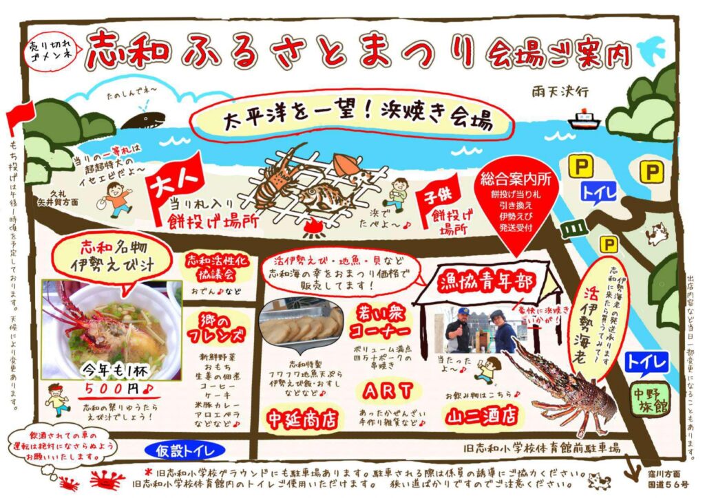 大好評の伊勢えび汁や、買った魚をその場で焼いたり刺身で食べたりできるよう、志和の浜を浜焼き会場として開放します!炭と網には限りがありますのでお気を付けください。