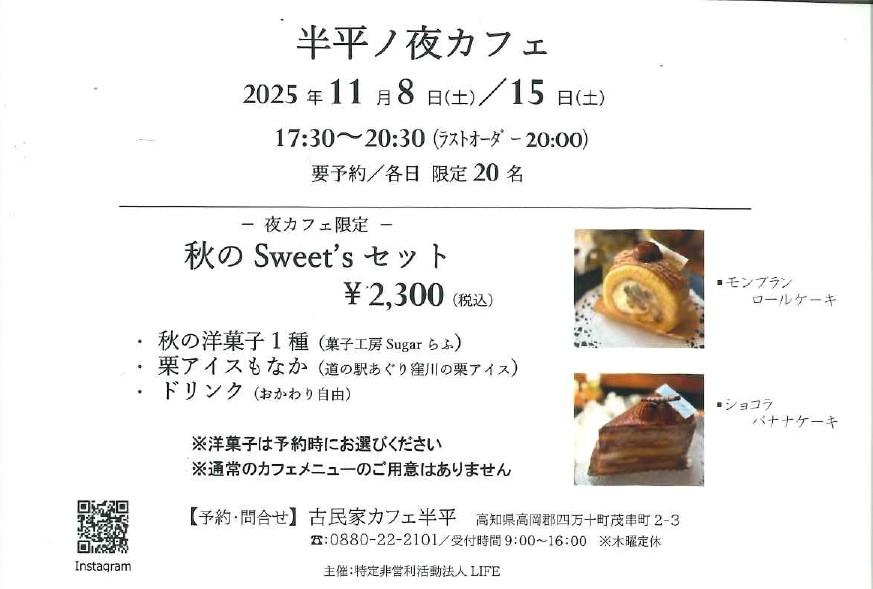 【予約・問合せ】古民家カフェ半平 TEL 0880-22-2101 / 9:00~16:00 ※木曜定休